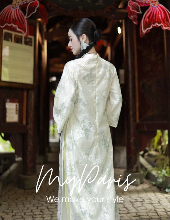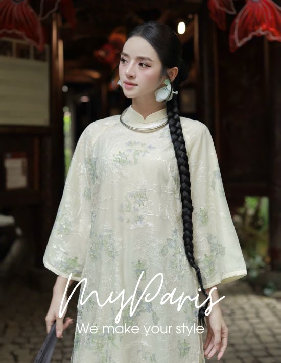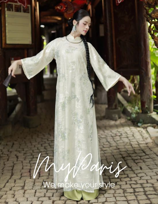 Áo dài xanh thêm nổi kèm quần lụa tà đôi chính hãng MYPARIS