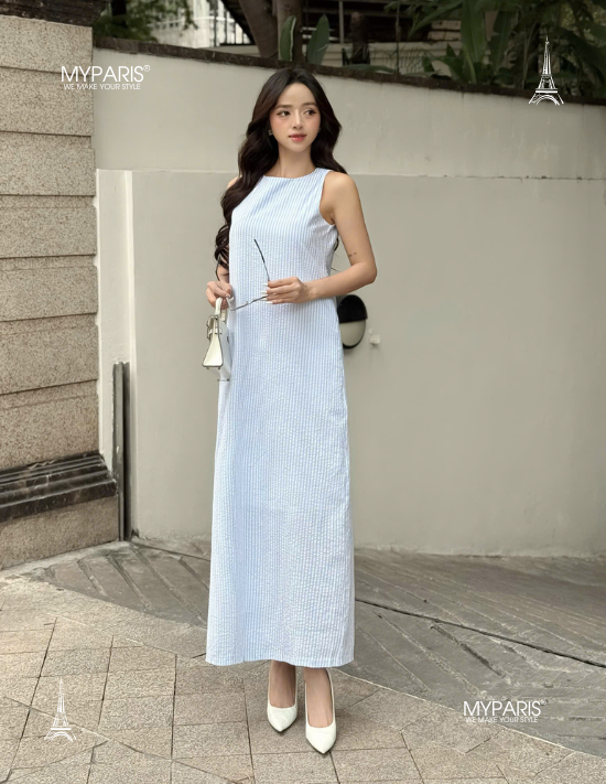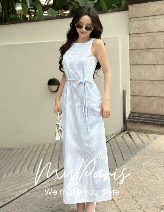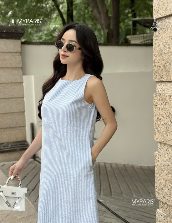 Đầm suông kate sọc sát nách phối dây eo đuôi sam chính hãng MYPARIS