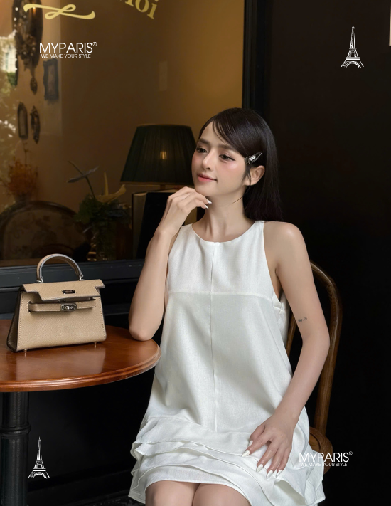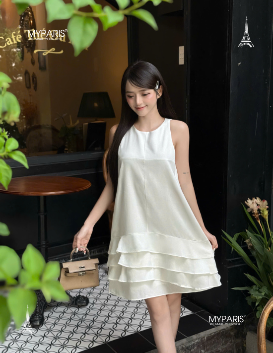 Đầm suông linen dáng ngắn chân váy đuôi cá xếp tầng chính hãng MYPARIS