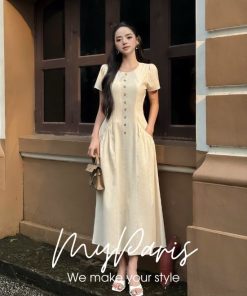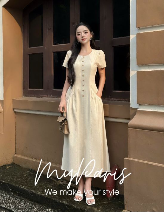Đầm suông midi linen phối nút chính hãng MYPARIS