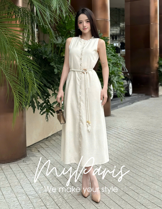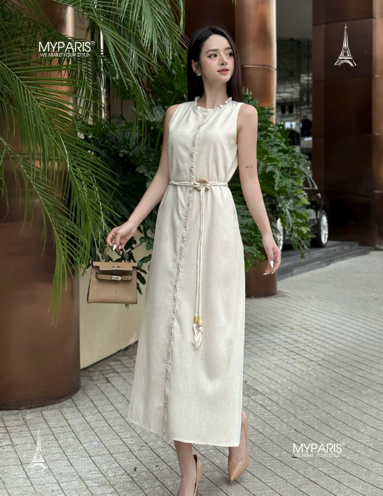 Đầm suông sát nách linen phối bèo cổ chính hãng MYPARIS
