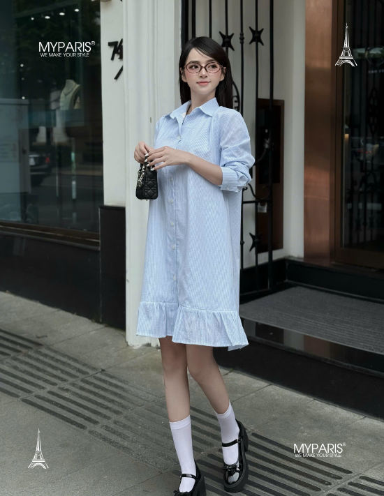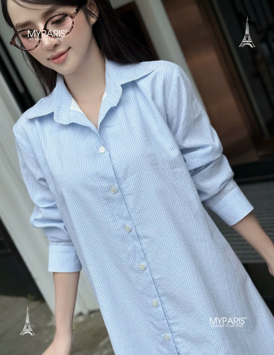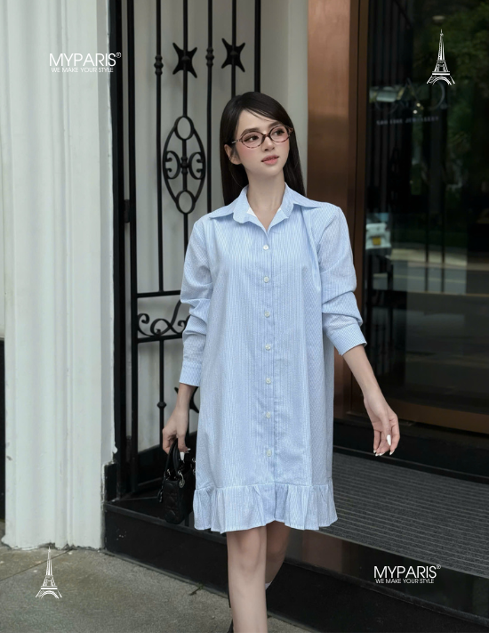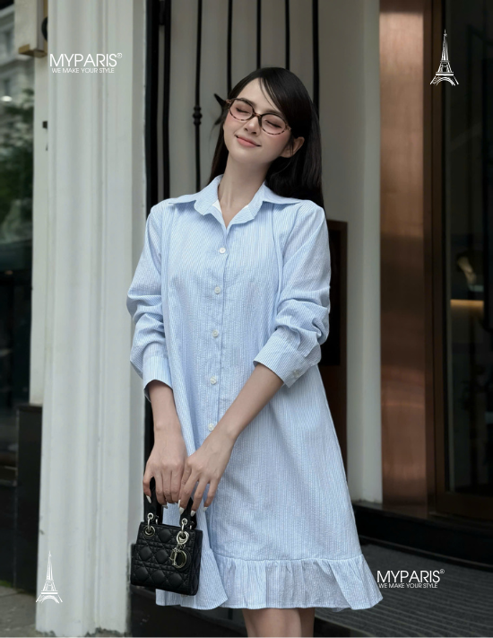 Đầm suông sơ mi kate sọc tay dài chân váy đuôi cá chính hãng MYPARIS