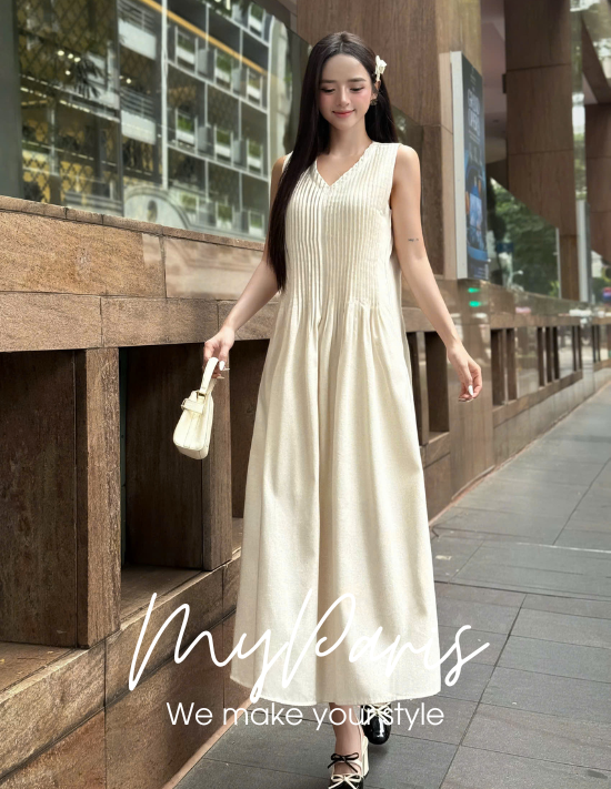 Đầm suông suông linen cổ tim xếp nhún phối dây eo chính hãng MYPARIS